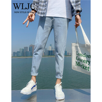 威廉爵驰牛仔裤男20夏季薄款潮流宽松直筒休闲九分长裤韩版潮牌百搭裤子男 浅蓝色 30(105-115斤) |
