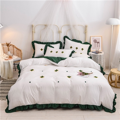 【锦软贴身】泫雅花毛巾绣荷叶边四件套【聚酯纤维/四叶草-白绿】 |