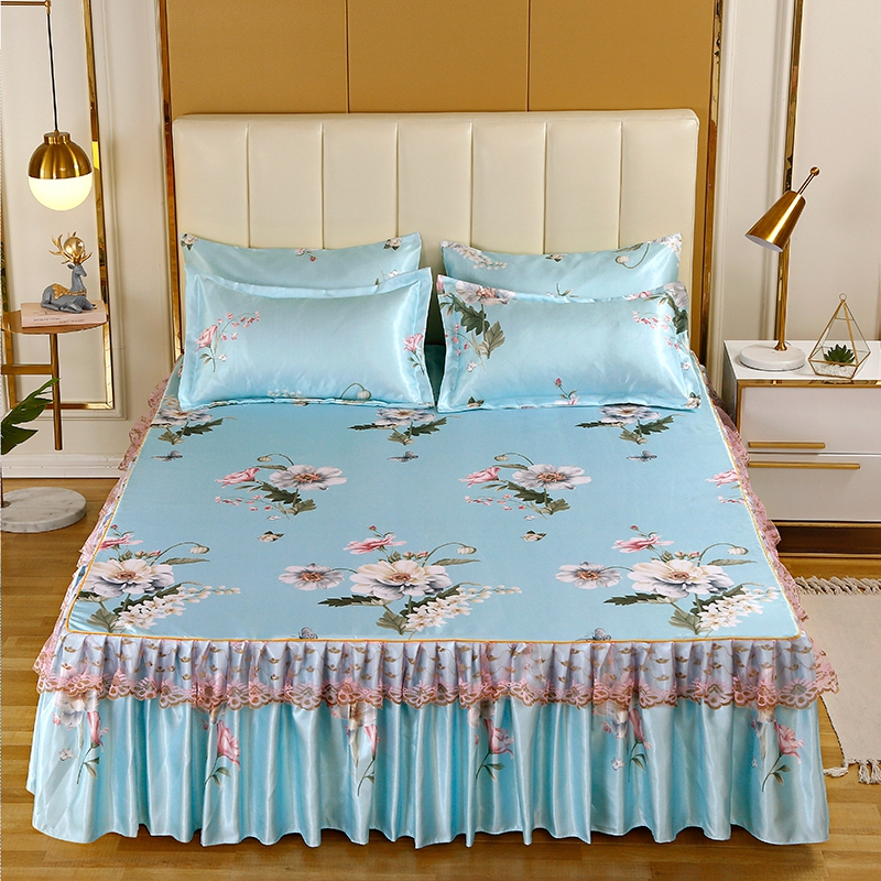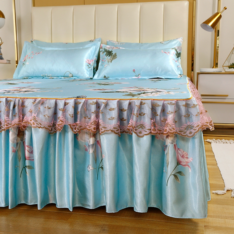 印花蕾丝床裙款冰丝席凉席三件套【冰丝(聚酯纤维)/花叶情深-兰】 |