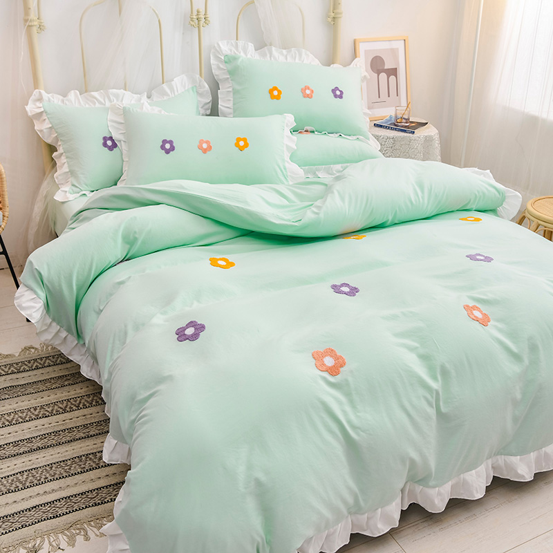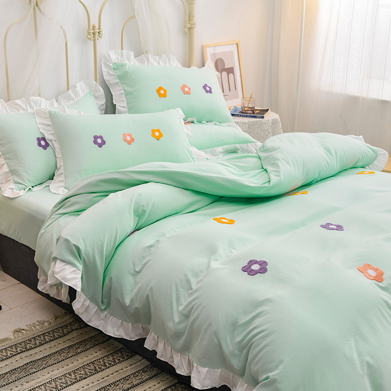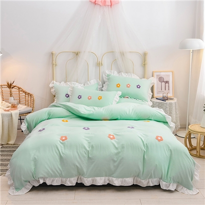 【锦软贴身】泫雅花毛巾绣荷叶边四件套【聚酯纤维/泫雅花-水绿】 |