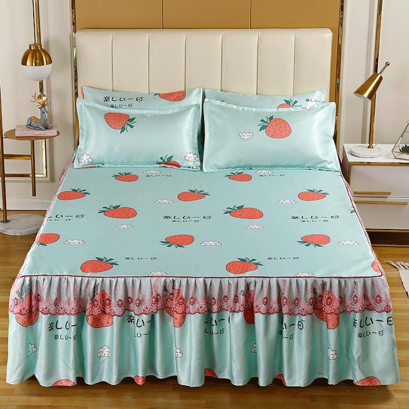 印花蕾丝床裙款冰丝席凉席三件套【冰丝(聚酯纤维)/草莓心语】 |