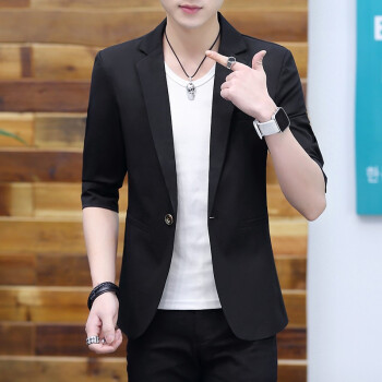 半双西服男夏季新款青年潮流纯色七分袖小西装婚礼伴郎礼服韩版修身职业正装外套男士商务休闲夹克Y 黑色 M(建议95-105斤) |