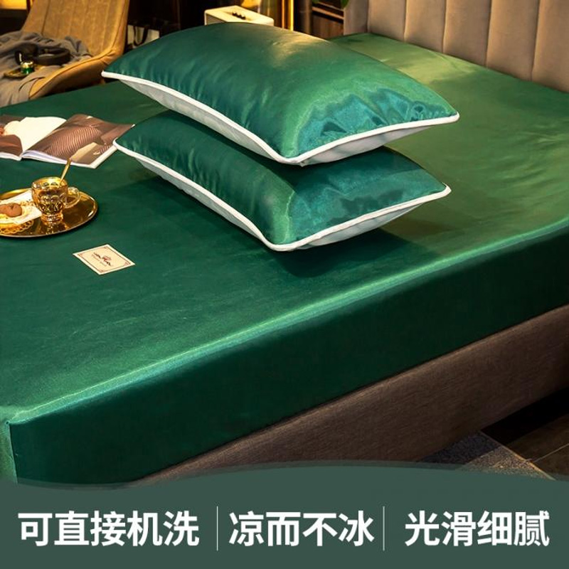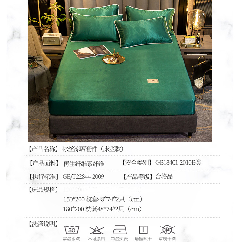 【柔软清爽 凉而不冰】无印床笠款冰丝席三件套【冰丝面料(聚酯纤维)/贵族-绿】 |