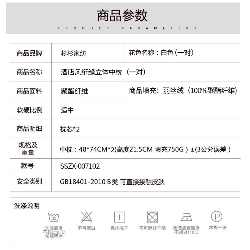 酒店风绗缝立体中枕(一对)【面料:聚酯纤维 填充:羽丝绒(100%聚酯纤维)/白色(一对)】 |