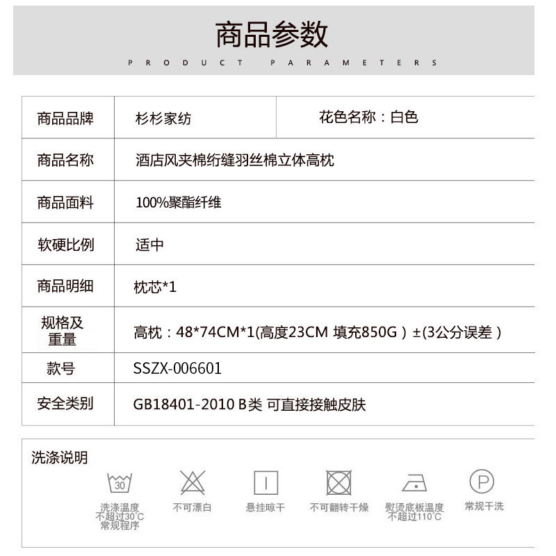 酒店风夹棉绗缝羽丝棉立体高枕【面料:聚酯纤维 填充:羽丝绒(100%聚酯纤维)/白色】 |