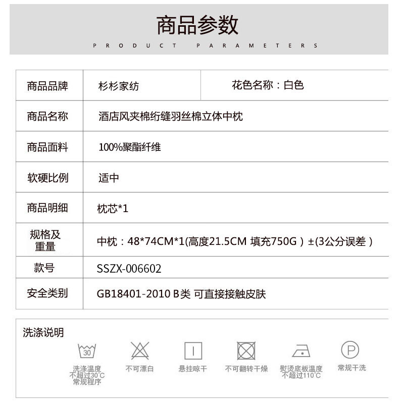 酒店风夹棉绗缝羽丝棉立体中枕【面料:聚酯纤维 填充:羽丝绒(100%聚酯纤维)/白色】 |