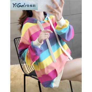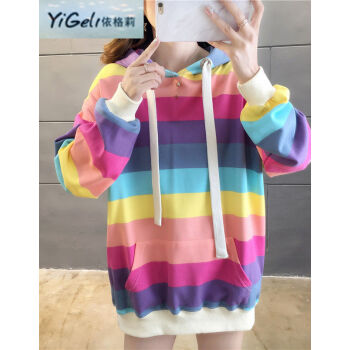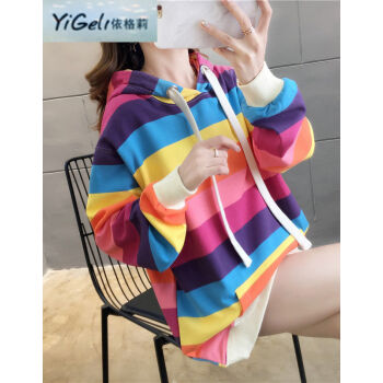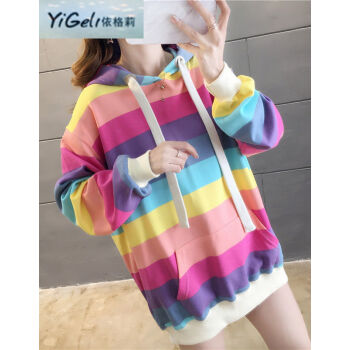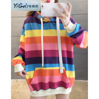 依格莉中学生少女秋天流行卫衣女春秋新款ins超火高中初中生宽松中长款彩虹条纹连帽大码长袖卫衣 浅色 M |