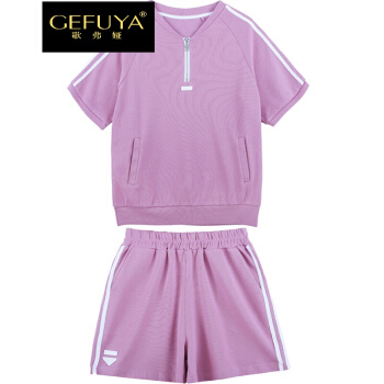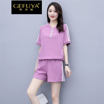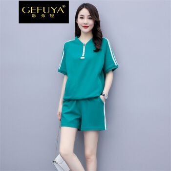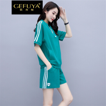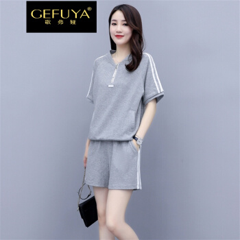 歌弗娅品牌 休闲运动套装女夏款新欧洲站晨跑锻炼时尚短袖短裤卫衣两件套 灰色 M |