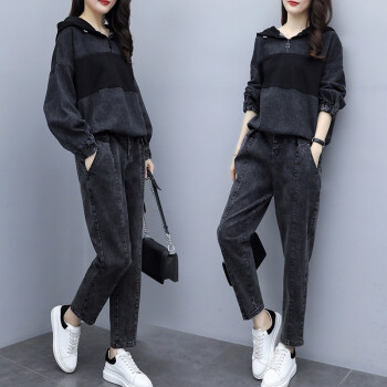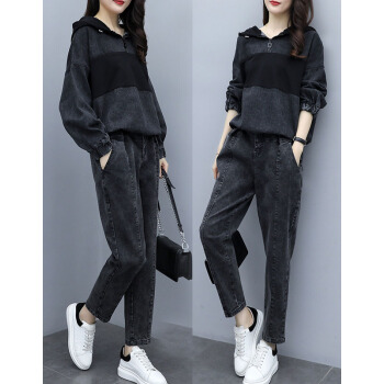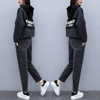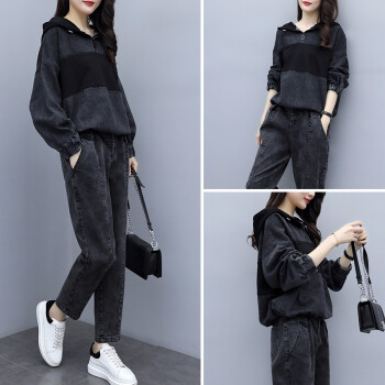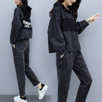 歌卡兰卫衣套装女牛仔秋季新品休闲气质显瘦时尚套装女运动服连帽外套女牛仔裤宽松卫衣女2317 黑色 XL |