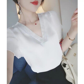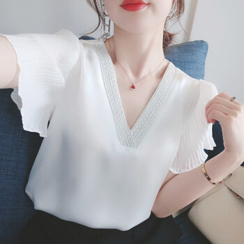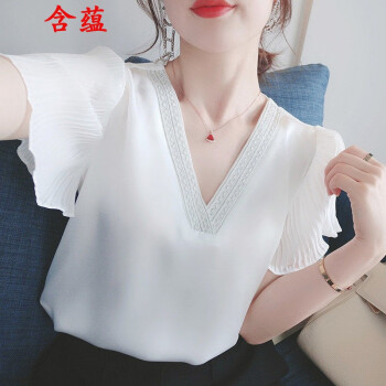 含蕴 超仙雪纺衫女夏季新款白色短袖宽松v领上衣洋气衬衫气质小衫衬衣女 白色 S |