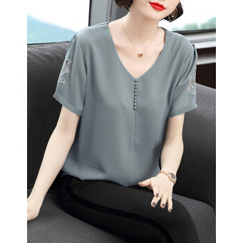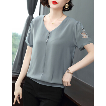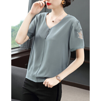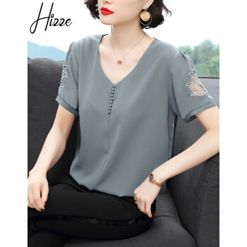 【精选好货】Hizze短袖雪纺衫女新款夏装时尚洋气雪纺上衣大码中年妈妈装碎花遮肚小衫T恤夏 浅灰蓝 请拍正确尺码 |