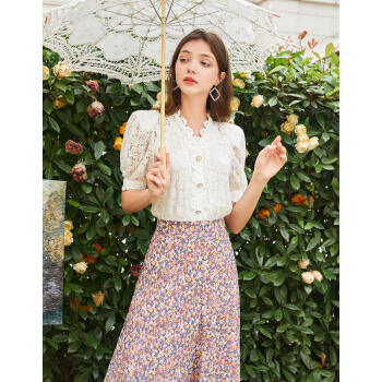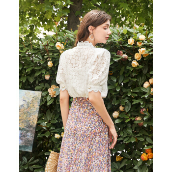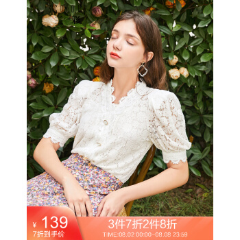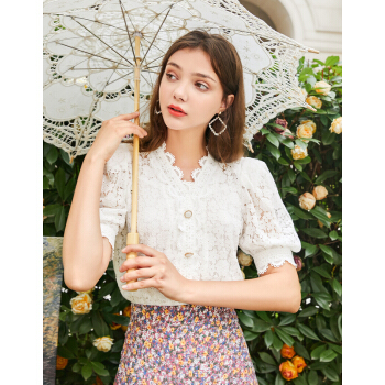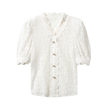 三彩秋季新款花边V领花朵蕾丝直筒复古泡泡袖中袖衬衫上衣女 白色 170/92A/XL |