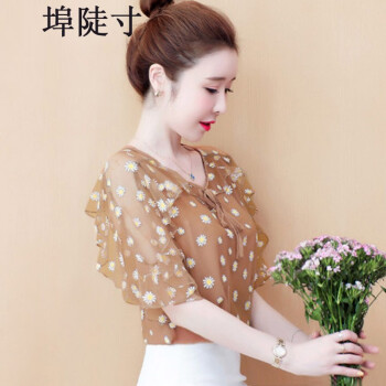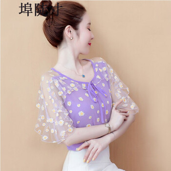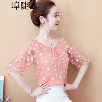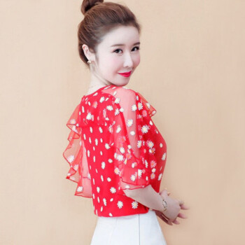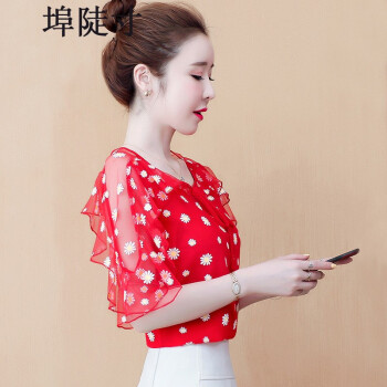 雪纺衫女埠陡寸夏季新品宽松显瘦蝴蝶结印花系带荷叶袖短袖上衣女 红色 S【80-95】 |