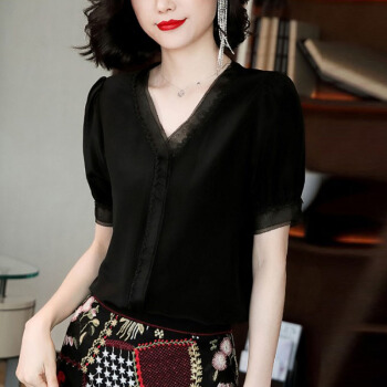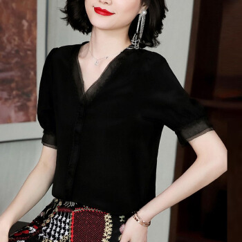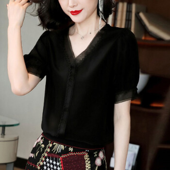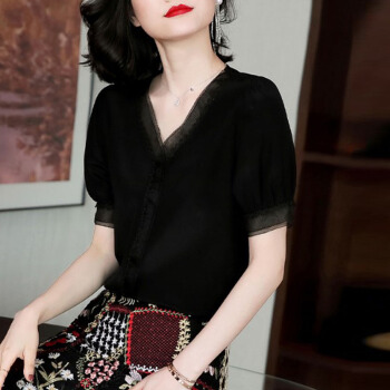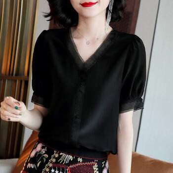 雪纺衫女短袖夏季新款女装韩版衬衫时尚设计感小众V领衬衣气质套头上衣潮 黑色 XXL |