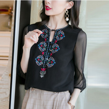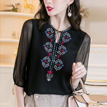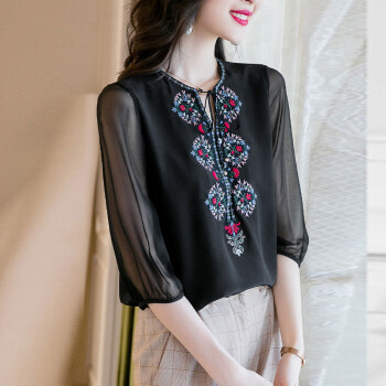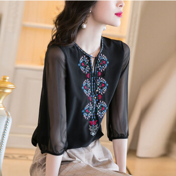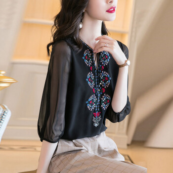 依语幽香复古绣花雪纺衫女夏季新款时尚v领透视短袖上衣 黑色 L |
