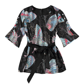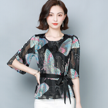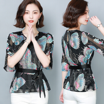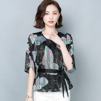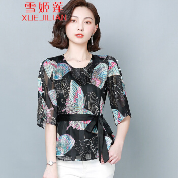 雪姬莲 雪纺衫女短袖夏装新款上衣系带显瘦衬衫女印花遮肚洋气小衫#6924 黑色 L |