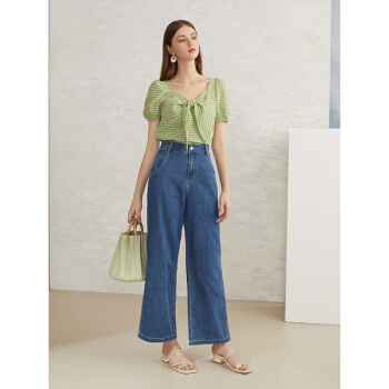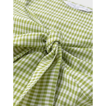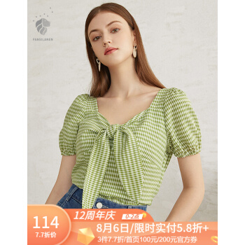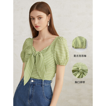 范思蓝恩 夏季新款复古泡泡袖雪纺衫女设计感小众胸前绑带上衣 青格纹 L |