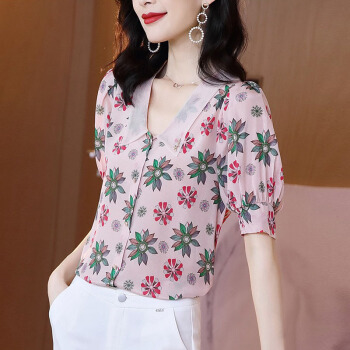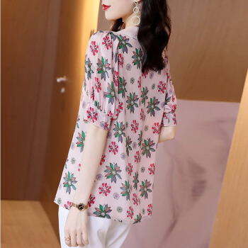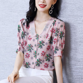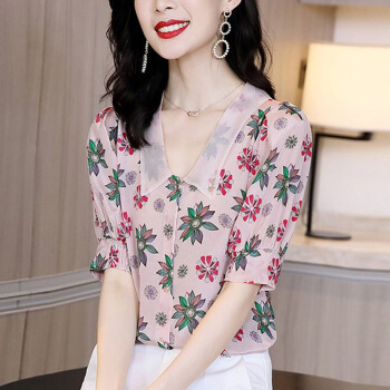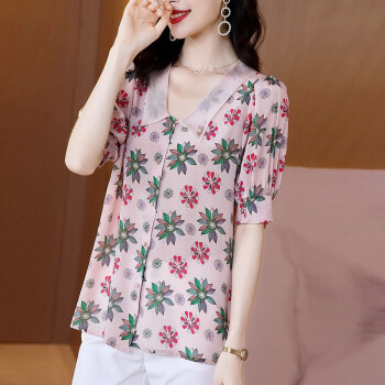 碎花雪纺衫女短袖夏季新款娃娃领衬衫洋气小衫法式泡泡袖时尚减龄气质衬衣潮 粉红色 L |