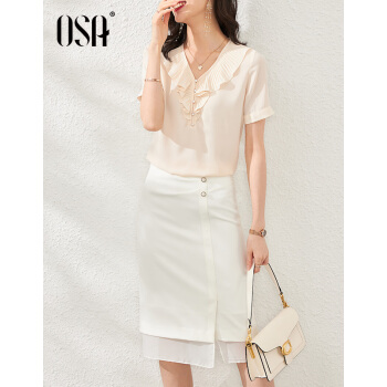 OSA女士短袖雪纺衫夏季新款欧洲站时尚洋气遮肚子小衫上衣 浅杏色 S |