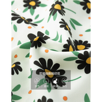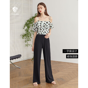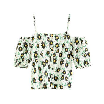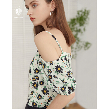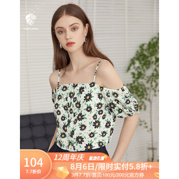 范思蓝恩 夏新款碎花雪纺衫短款一字肩上衣女短袖露肩吊带小衫 白底印花 XS |