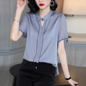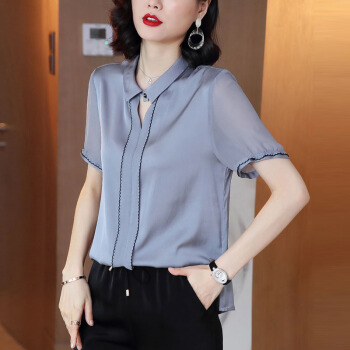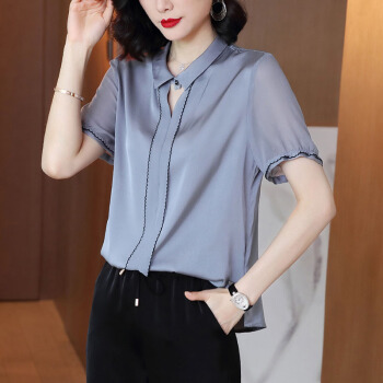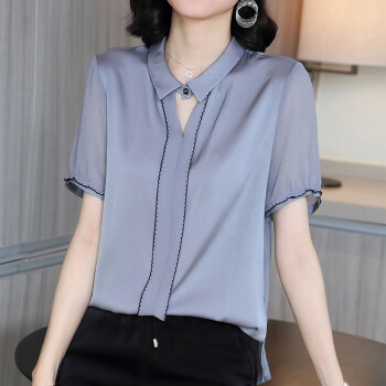 依语幽香休闲衬衫女装夏季新款短袖通勤衬衣百搭上衣缎面纯色 浅灰色 L |