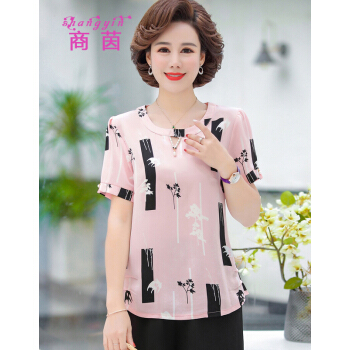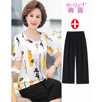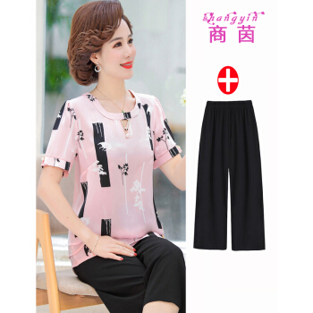 商茵SY中老年女装妈妈装新款夏装短袖衬衫减龄洋气雪纺衫中年人t恤中老年女装上衣+裤子套装 粉红色+阔腿裤 2XL【建议105-120斤】 |