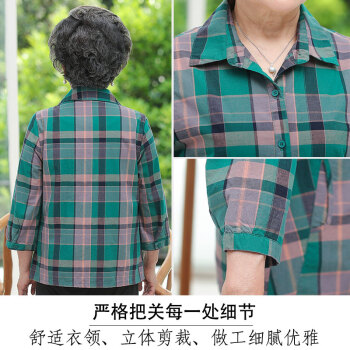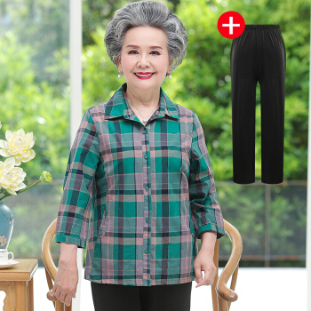 孝珍老年人女装夏装纯棉九分袖衬衫奶奶装格子衬衣套装中老年妈妈装两件套 绿格子+裤子 2XL码(建议体重105-120斤) |