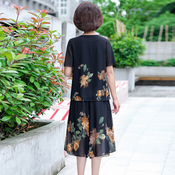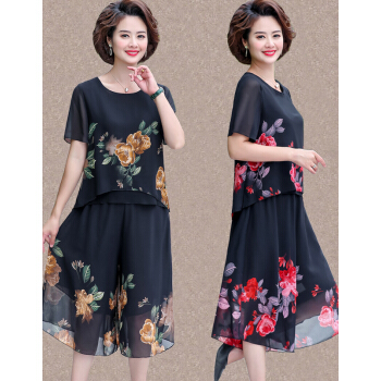 晳馥香中老年女装妈妈夏装两件套连衣裙女大码新款40岁50中年女装雪纺衫短袖t恤洋气套装 红花 (请拍对应尺码) |