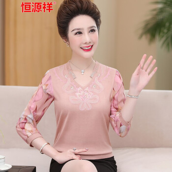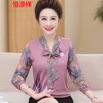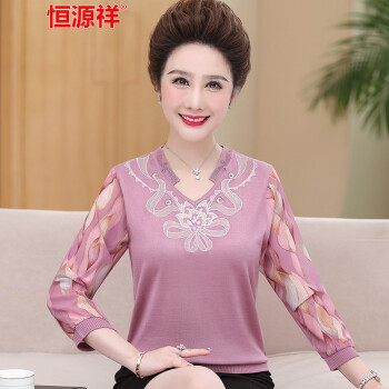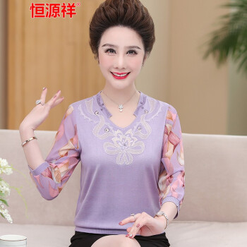 恒源祥中老年女装妈妈装长袖t恤女士针织秋季新款中年大码圆领纱袖上衣九分袖老年人奶奶装打底衫 7220浅紫 xL建议110--125斤 |