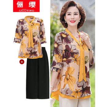 俪缨中老年女装夏装休闲套装女短袖上衣新款洋气4050岁中年妇女雪纺衫两件套阔太太妈妈装小衫 1号色+阔腿裤 2XL(建议105-120斤穿) |