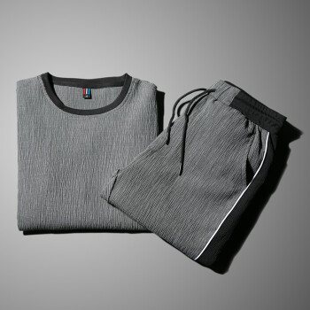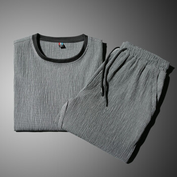 艾特兰 【上衣+裤子】男士冰丝短袖t恤夏季套装男薄款夏天一套帅气潮牌休闲运动长裤亚麻套装男衣服 925长裤套装灰色 XL(125-140斤) |