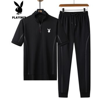 短袖套装t恤男2件套夏季新品短袖立领休闲T恤九分裤衫透气上衣短运动 ATD2868黑色 |