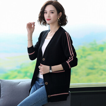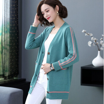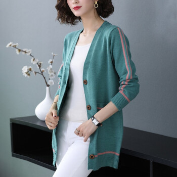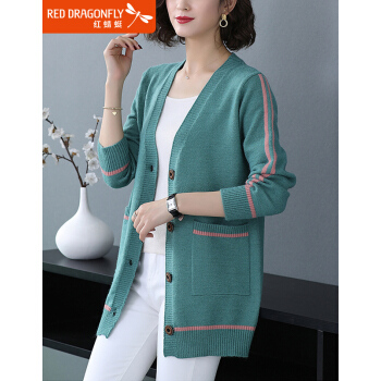 红蜻蜓 针织衫女春秋季新款女装中长款开衫宽松大码V领针织毛衣上衣外套女 9960 绿色 M |