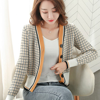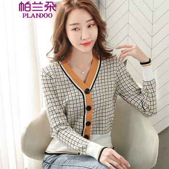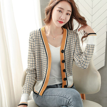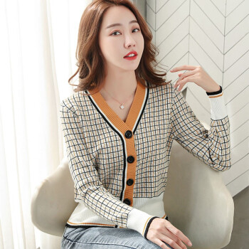 帕兰朵 针织衫女秋季新款韩版格纹时尚针织开衫女潮流宽松显瘦毛衣外搭外套 黄色 请拍正确尺码 |