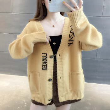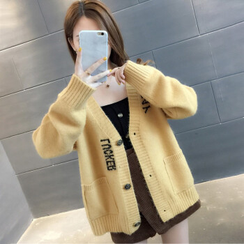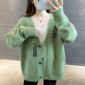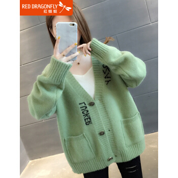 红蜻蜓 针织衫女秋装新款韩版V领字母口袋提花针织外套上衣宽松毛衣女开衫 WL727-2 绿色 均码 |
