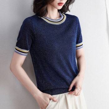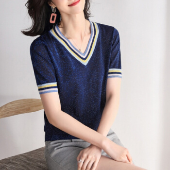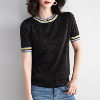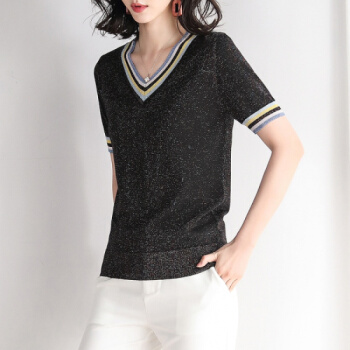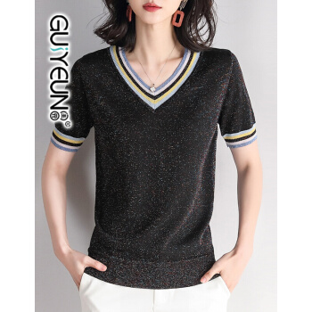 闺园(GUIYUAN)针织衫女夏季冰丝女士薄短袖上衣T恤宽松v领亮丝短款打底衫内搭 黑色 请拍正确尺码 |