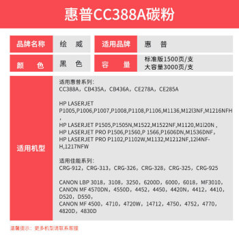 绘威CC388A 88A碳粉6支装 适用惠普HP P1007 P1106 P1108 M126a M128fp M1136 M1216nfh打印机硒鼓 墨粉 |