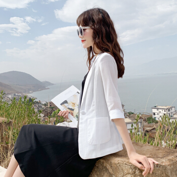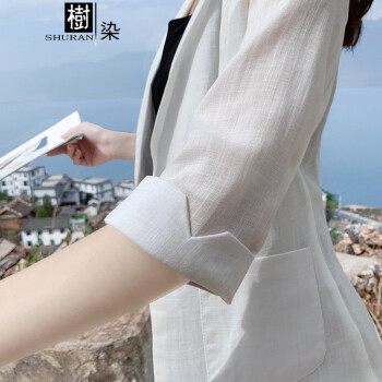 樹染潮牌亚麻小西装女薄款透气防晒衣中长款夏季新款修身休闲韩版百搭棉麻职业西服大码外套 白色(七分袖) M 体重98至107斤 |