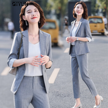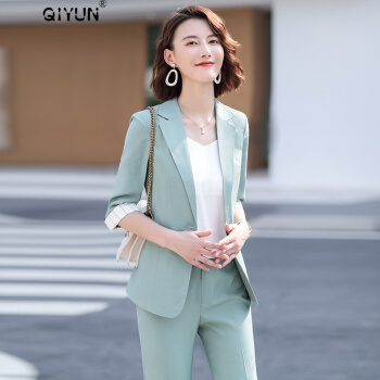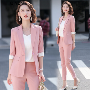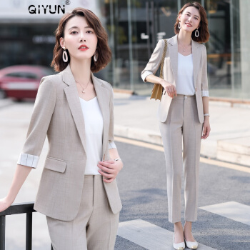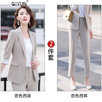 QIYUN轻奢品牌女装 小西装职业套装女夏季新款大码气质休闲时尚九分裤薄款显高显瘦西服外套 杏色西装+九分裤【需要短裤请备注】 M |