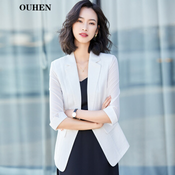 OUHEN轻奢品牌女装小西装外套女夏季新款薄款白色七分袖韩版休闲网纱拼接西服女上衣 白色中袖西装 L(建议96-105斤) |