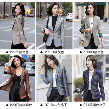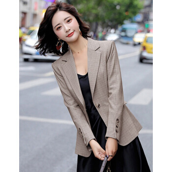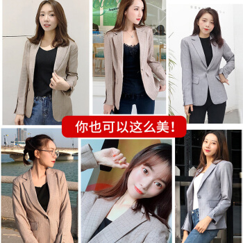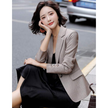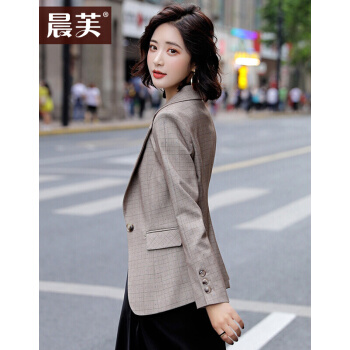 晨芙小西装女长袖休闲格子外套秋冬款气质修身英伦风网红款韩版显瘦短款小个子复古西服女上衣潮 19921杏色外套 L |