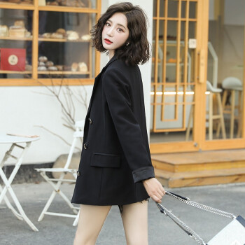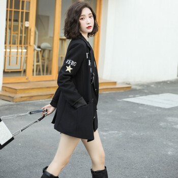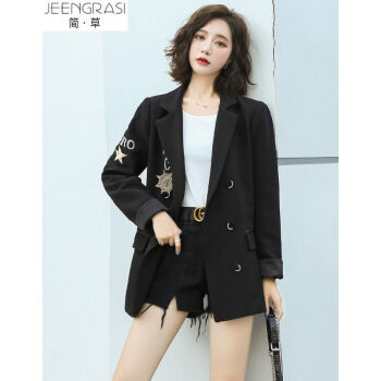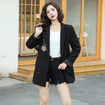 简草 小西装女中长款秋季新款时尚简约百搭个性潮流气质翻领刺绣黑色长袖西服外套女X8958 黑色 S |