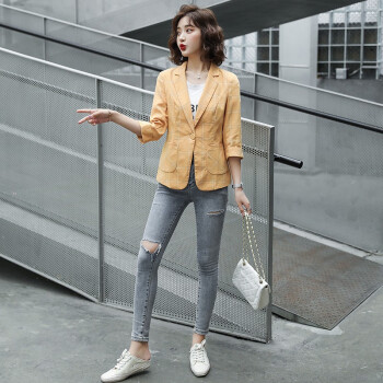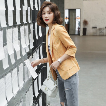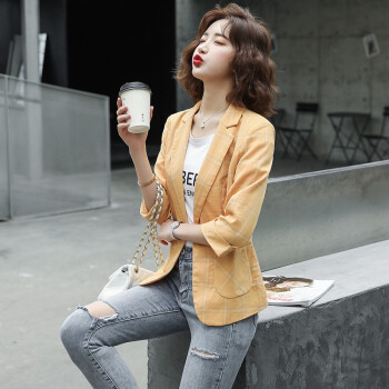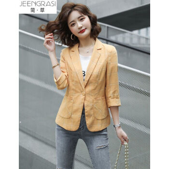 简草 小西装女秋装新款韩版时尚通勤简约气质百搭潮流格纹一粒扣七分袖西服外套女X8988 黄色 XL |