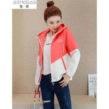 简草 短外套女秋季新款时尚潮流休闲百搭韩版气质拼色长袖连帽外套女D5812 桔色 L |