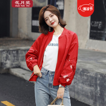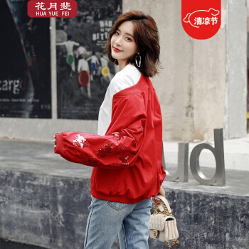 花月斐刺绣短外套女新款韩版宽松亮片棒球衫简约显瘦女士外套1992 红色 L |