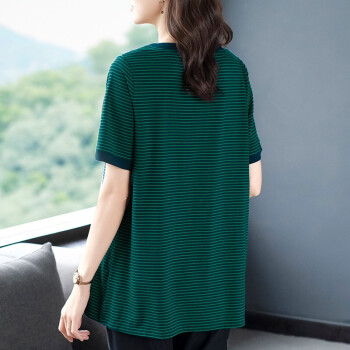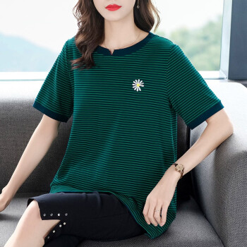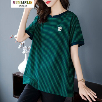 木棉林胖妹妹mm宽松t恤女韩版加大码女装新款夏装200斤显瘦条纹中长款洋气上衣L202733 蓝底绿条 3XL建议160-180斤 |