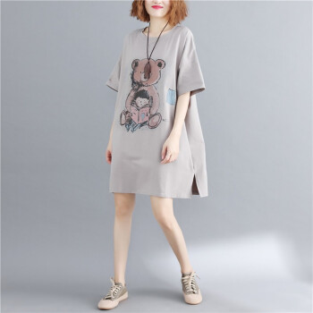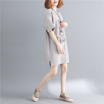 可馨怡 胖妹妹夏装纯色遮肚子显瘦文艺大码女装胖mm宽松卡通印花短袖T恤连衣裙 图片色 大码均码【110-220斤】 |