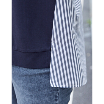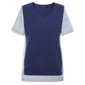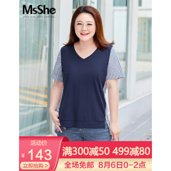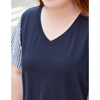 MsShe大码女装新款夏装胖mm显瘦人棉凉爽舒服条纹拼接V领T恤 银河蓝色现货 3XL |