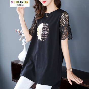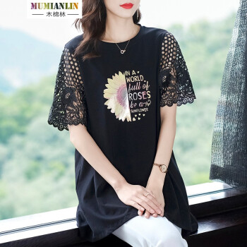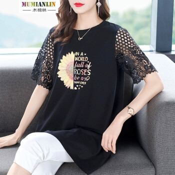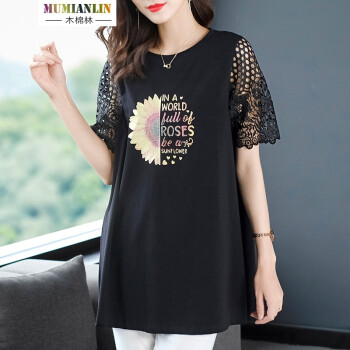 木棉林高端大码女装新款夏装胖妹妹mm减龄镂空拼接洋气印花中长款宽松显瘦T恤女L202797 黑色 2XL建议140-160斤 |
