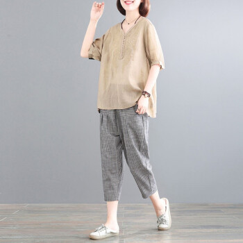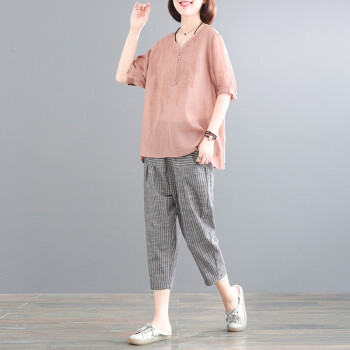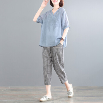 芷依丽 时尚套装女夏季新款韩版刺绣宽松大码显瘦减龄短袖T恤女休闲九分哈伦裤两件套 蓝上衣+条纹裤 M |